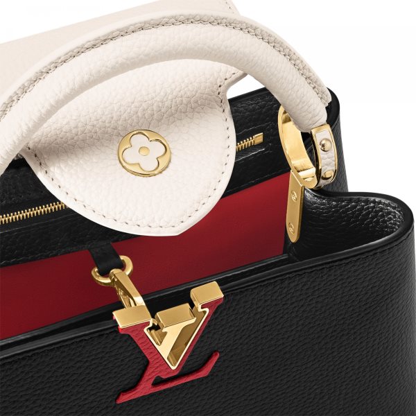 The classic Capucines BB handbag is made from deep-dyed Taurillon leather with a color treatment in which the color of the flap, handle, and inner strap perfectly complement the hue of the rest of the bag. The on-trend strap – wide and removable – and top handle enable a variety of carry options.